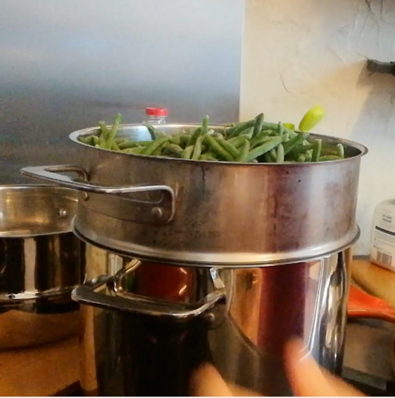 On va s'occuper de la sauce Marion. On dépose l'oignon sans l'éplucher dans le vitaliseur sur les haricots verts et laisser cuire 10 minutes