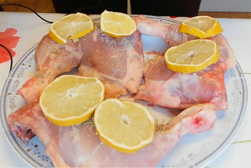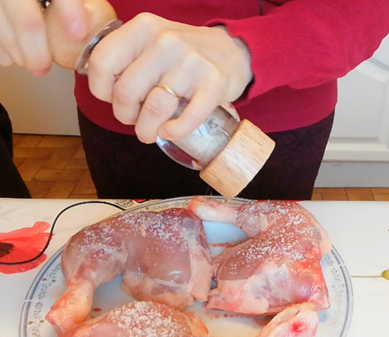 Pendant ce temps, on s'occupe de la viande. On la sale généreusement, on parsème de thym et on pose une rondelle de citron sur chaque cuisse.